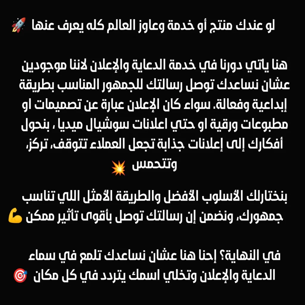 خـــــدمــاتـنـا التصميم خدمة التصميم تتضمن انشاء تصاميم بصرية مبتكرة للتواصل الفعال مع العملاء وجذب الانتباه من خلال استخدام الالوان والصور والنصوص . الطباعة خدمات الطباعة الورقية تتضمن انتاج مواد مطبوعة عالية الجودة مثل الكتب والمجلات والكروت باحجامها وتصاميم مخصصة لتلبية احتياجات العملاء وجذب انتباههم . التسويقخدمة التسويق تهدف الي تعزيز الوعي بالعلامة التجارية وزيادة المبيعات من خلال استراتيجيات مبتكرة تستهدف الجمهور المناسب علي وسائل التواصل الاجتماعي .